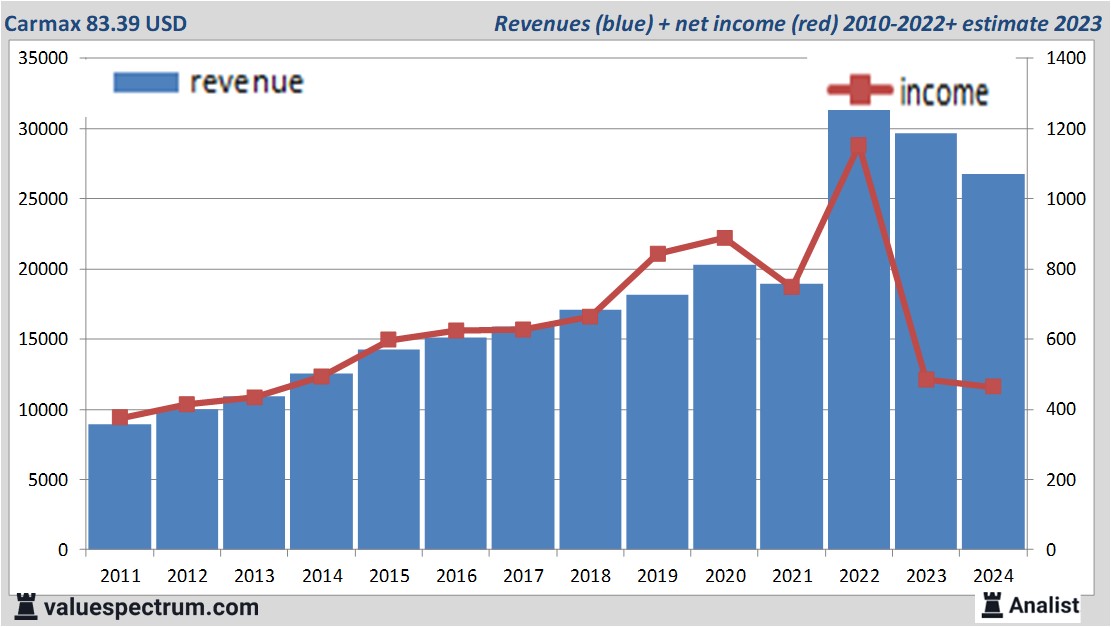 Carmax komt morgen met haar resultaten over het voorbije kwartaal. De omzet van het bedrijf uit Richmond over dit jaar komt uit op 26.77 miljard dollar. Zo blijkt uit de meeste recente rondgang langs de analisten. Dit is vrij beperkt minder dan de totale opbrengsten over 2022 toen de omzet 29.68 miljard dollar bedroeg.