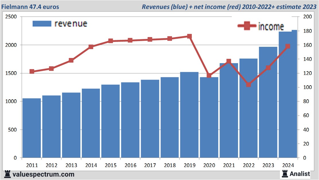 De consensus van de dividenduitkering ligt op 1.13 euro per aandeel. Fielmann 's dividendrendement komt hiermee uit op 2.38 procent. Het doorsnee dividendrendement van de persoonlijke goederensector ligt op een zeker aantrekkelijke 2.95 procent.