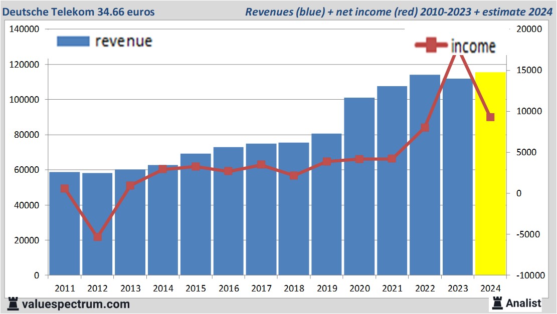 Morgen publiceert het Duitse Deutsche Telekom haar resultaten over het afgelopen kwartaal. Over het huidige boekjaar komt de omzet van het bedrijf uit Bonn volgens de analisten uit op 115.43 miljard euro. De totale omzet zou volgens de analisten dit jaar dan het hoogste in haar bestaan zijn. Dit is licht meer dan de omzet over 2023 toen de omzet 111.97 miljard euro bedroeg.