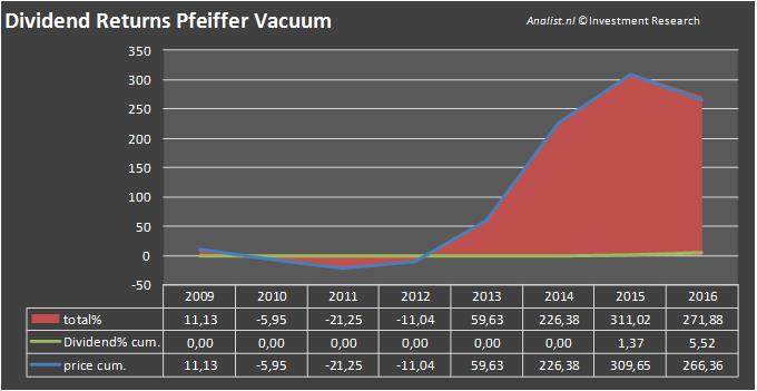 Per aandeel verwachten de analisten een dividend van 3,45 euro. Pfeiffer Vacuum 's dividendrendement komt hiermee uit op 4,09 procent. Het gemiddelde dividend van de industriele bedrijven ligt op een schamele 1,30 procent.