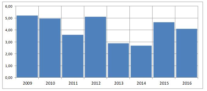 De uitgekeerde dividenden over de afgelopen jaren zijn met gemiddeld 4,4 per jaar behoorlijk te noemen. De belegger die ieder jaar vanaf 2008 zijn dividenden herbelegd zou hebben heeft nu een royaal extra rendement van 47 procent. De invloed van de ontvangen dividenden op het totale rendement is dus op de lange termijn significant te noemen.