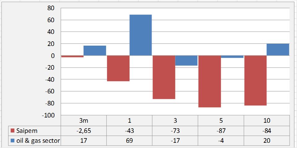 We zien dat het aandeel Saipem al jaren enorme verliezen leed. Beleggers die het aandeel 10 jaar terug zou hebben gekocht staat nu op een verlies van zelfs 84 procent. Dit in tegenstelling tot de oliesector die ruim 20 procent hoger noteert sinds begin 2007.