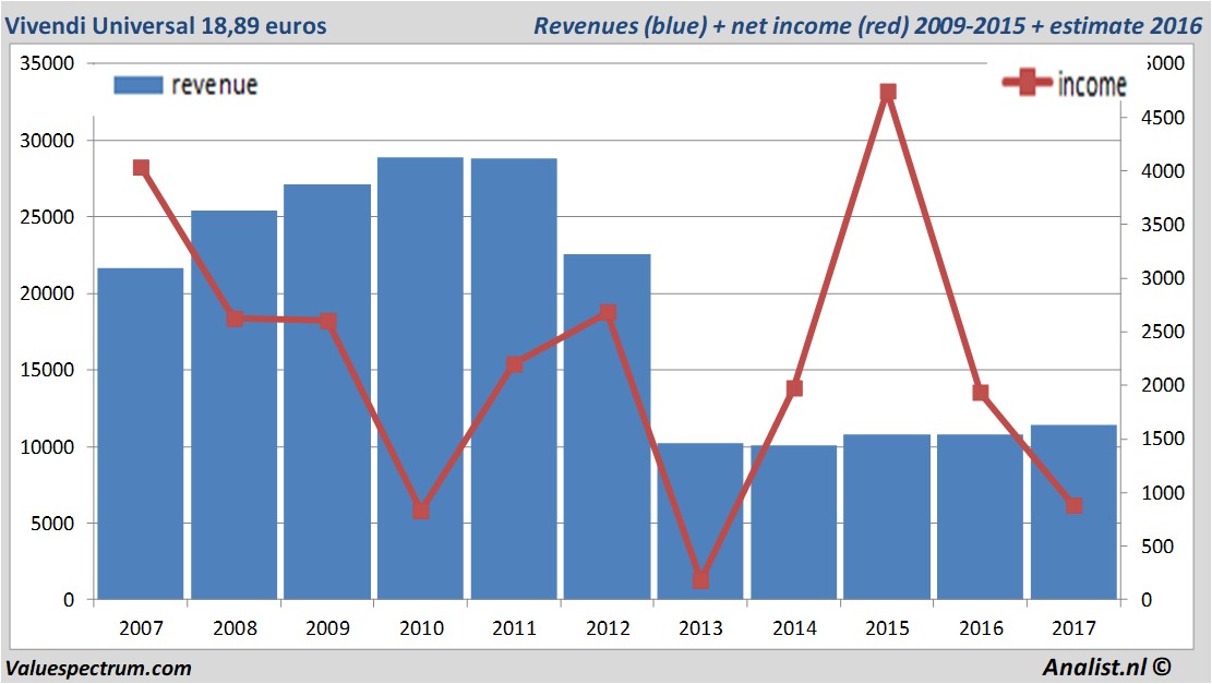 Vivendi Universal zal morgen haar resultaten over het voorbije kwartaal publiceren. Over het lopende jaar ligt de consensus van de omzet op 11,43 miljard euro. Dit is licht meer dan de omzet over 2016 toen de omzet 10,82 miljard euro bedroeg.
