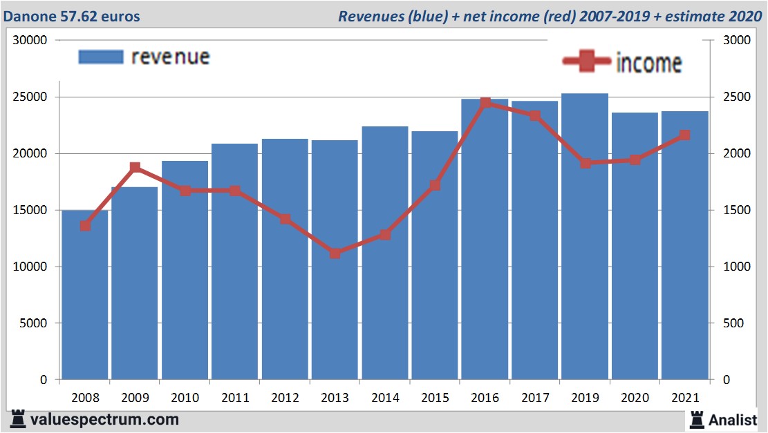 Morgen presenteert het Franse Danone haar resultaten over het afgelopen kwartaal. Over het lopende jaar ligt de consensus van de omzet van het bedrijf uit Parijs op 23.73 miljard euro. Dit is beperkt minder dan de omzet over 2019 toen de omzet 25.29 miljard euro bedroeg.