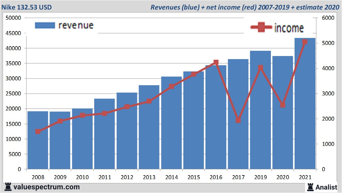 Over 2021 komt de omzet van het bedrijf uit Beaverton volgens de analisten uit op 43.35 miljard dollar. Dit is behoorlijk meer dan de omzet over 2020 toen de omzet 37.4 miljard dollar bedroeg.