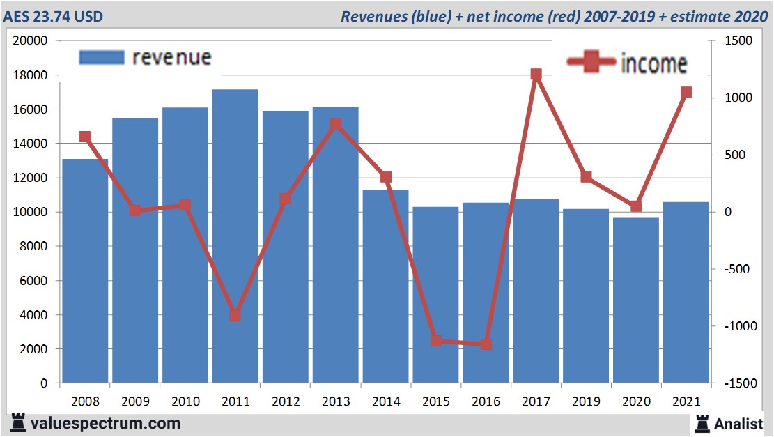 Per aandeel verwachten de analisten een dividend van 61 cent. AES 's dividendrendement is dus 2.57 procent. Het doorsnee dividendrendement van de energiesector ligt op een zeker aantrekkelijke 2.96 procent.